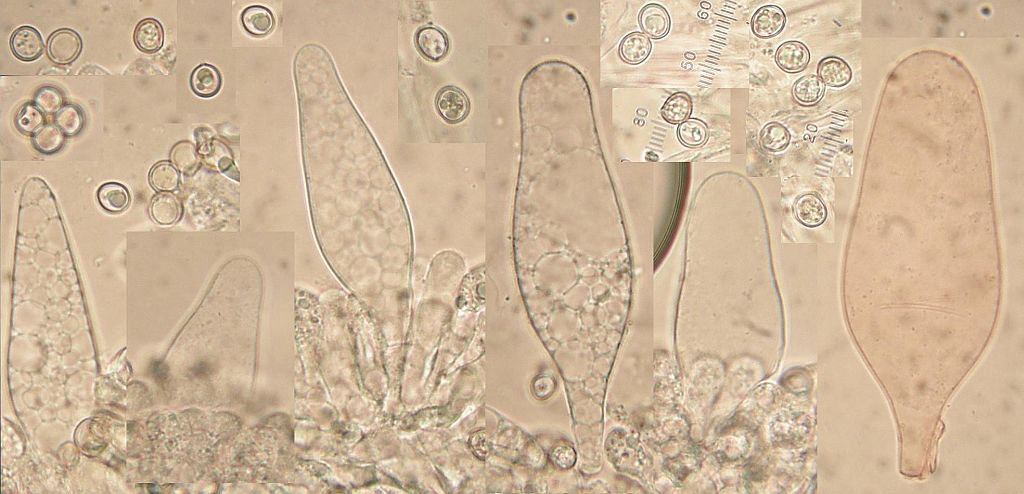 Merkt euch mal die Cheilozystiden (erstes Mikrobild) und die Pleurozystiden sowie die Sporen (2. Mikrobild).
