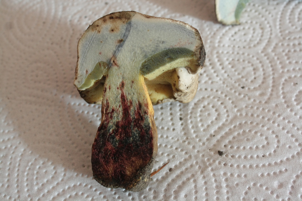 Auf der Arbeit dann noch mal länger begutachtet und den Verdacht auf Boletus radicans gehabt. Der oder der Schönfußröhrling. Bei einem Erstfund ist man sich so verdammt unsicher wegen jedem Detail.