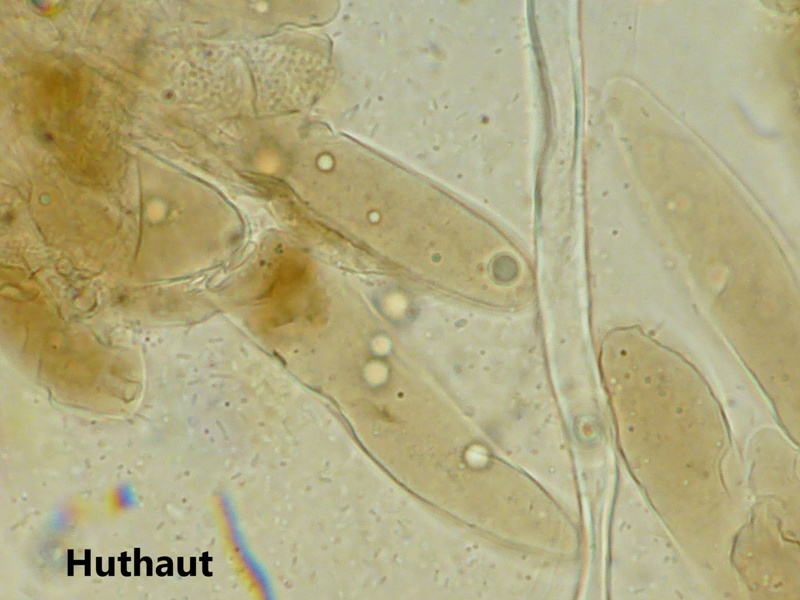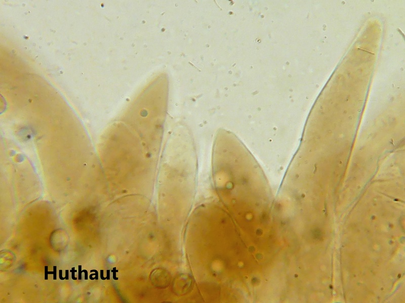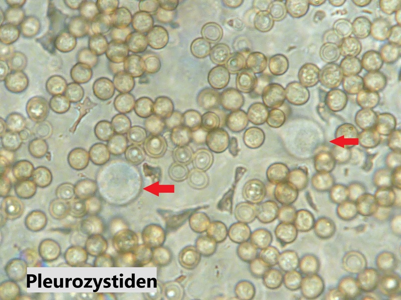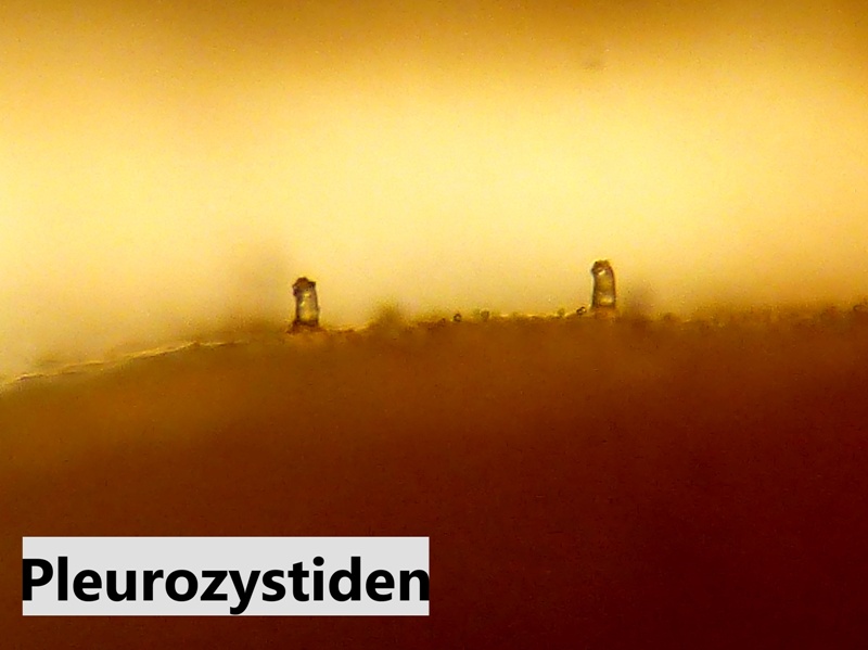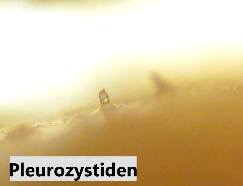 Pleurozystiden waren reichlich vorhanden, allerdings - soweit erkennbar- nicht mit Auswüchsen versehen. Es ist mir jedoch ein Rätsel, wie man die vernünftig fotografieren will. Bei einem Kammschnitt und ohne Deckgläschen komme ich auf keine ausreichende Vergrößerung. Mit Deckgläschen werden die Dinger auch ohne quetschen plattgedrückt und verschwinden zum größten Teil in der Sporenmasse. Ich kann daher diesbezüglich lediglich mit der Draufsicht und recht wenig vergrößerter Seitanansicht dienen.