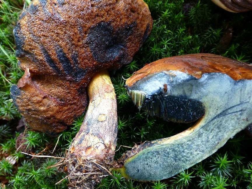 Fundort an Fichten, Stielbasis deutlich verjüngt, Stiel mittig verdickt, gelb-bräunlich längsferig, Poren vermutlich gelblich, hier bereits braun verfärbt, Huthaut filzig, samtig, sehr festes Fleisch, keinerlei Verfärbungen an Fleisch oder Poren, kein ausgeprägter Geruch, kein bitterer Geschmack, eher völlig neutral.
