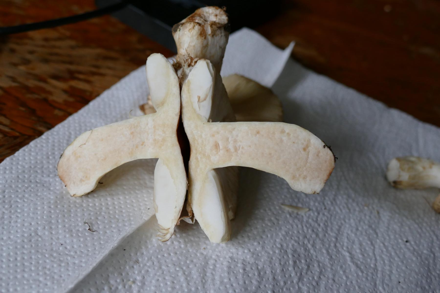 Bricht ohne Fasern, am Hutansatz weiß, darunter bräunlich-gelb