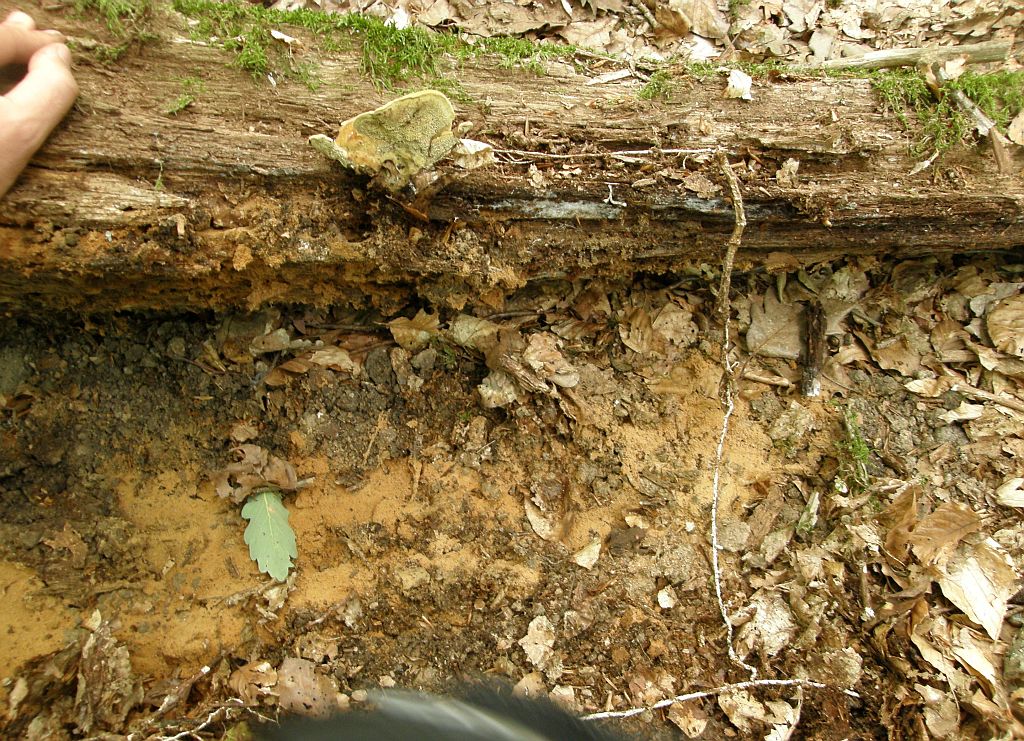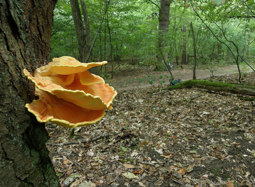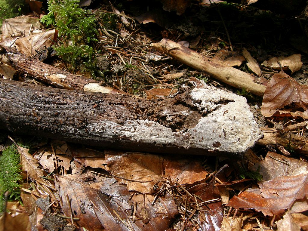 Und Ingo, falls du mitliest: Diesmal ist es sicher diese Art und es ist ganz sicher Eichenholz. Und der Pilz sitzt auch definitiv an diesem Stamm. Interessant sind aber die Rhizomorphen, die sich von dem Pilz über das Eichenholz und dann in den Waldboden und dort meterweit durchs Gedöns fortsetzen. Und ohne da den Ursprung gefunden zu haben: Irgendwo ist da Nadelholz, denke ich. Und dieser Fruchtkörper somit ein Übersteiger.