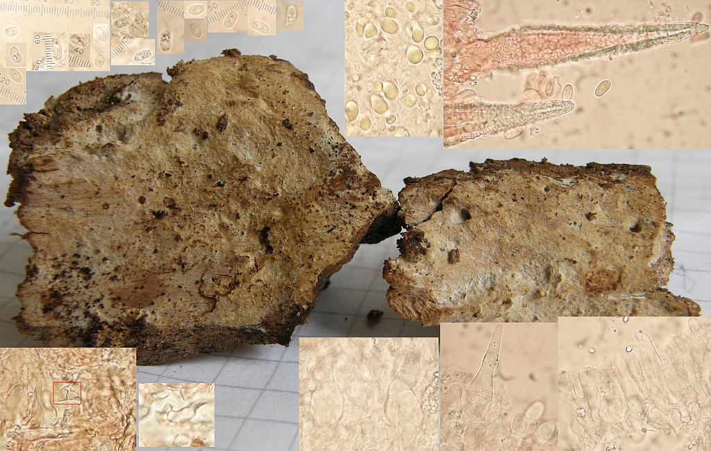 Trotz der seltsamen Farbe des Hymeniums, aber mikroskopisch passt alles. Die stark inkrustierten Skeletozystiden, die Sporenform und -Größe, die Skeletthyphen im Subikulum, deren Wände sich mit BWB nicht expressiv anfärben lassen.