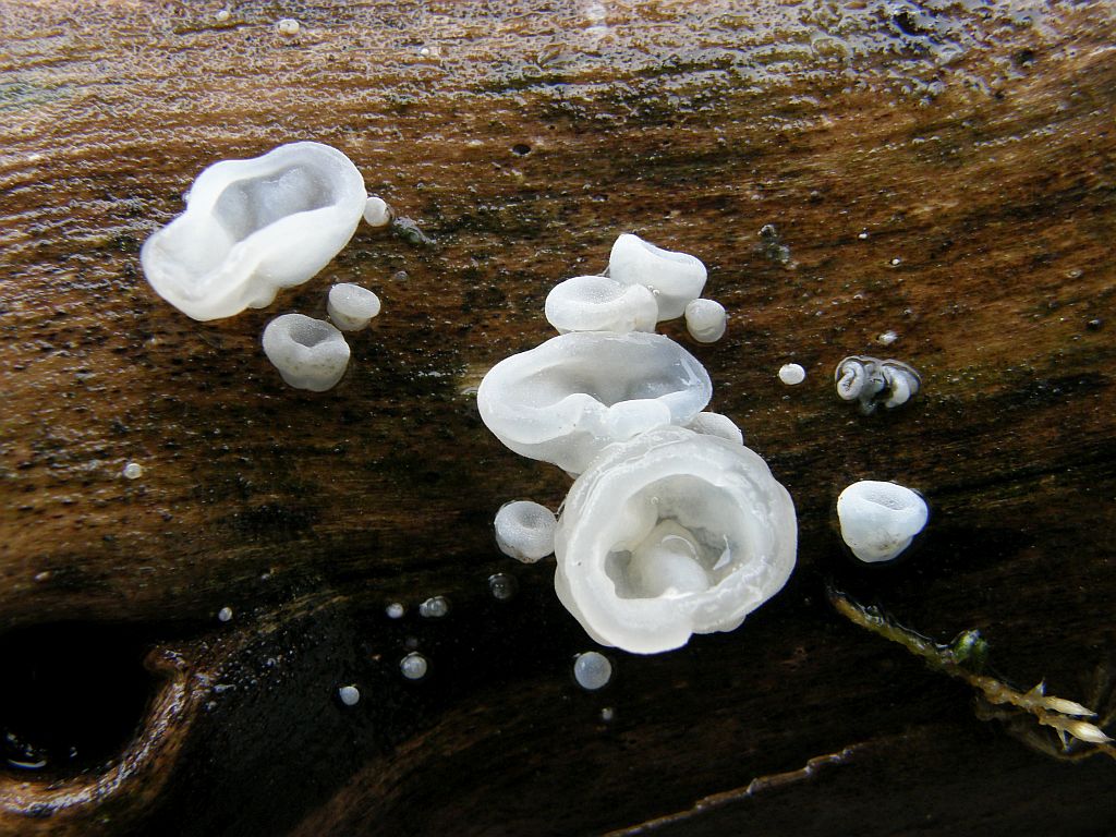 die Markus im Garten kultiviert und die tatsächlich seit seinem Fund immer wieder völlig farblos an dem Ast erscheinen. Insofern liegt da keine Beeinflussung durch Witterung vor, sondern das Mycel hat tatsächlich eine etwas andere Programmierung, daß es immer wieder Fruchtkörper mit Pigmentverlust hervorbringt.