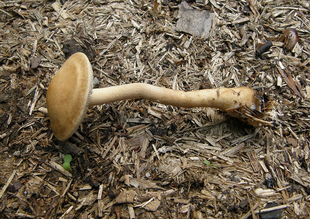 mit winzigem, kaum 1mm langem, lateralem Stielchen, mit dem er sich wohl durch die Erdschicht gearbeitet hat. Das Mycel scheint aber auf dem Holz draunter zu sitzen. Der Fruchtkröper ist ziemlich unreif und weigert sich auch, im Döschen nachzureifen. Vielleicht hat er es auch nicht verkraftet, daß ich eine Lamelle und ein Fitzelchen Huthaut entnommen habe.