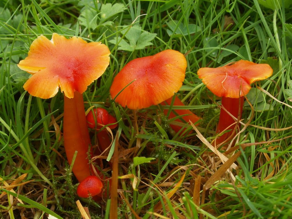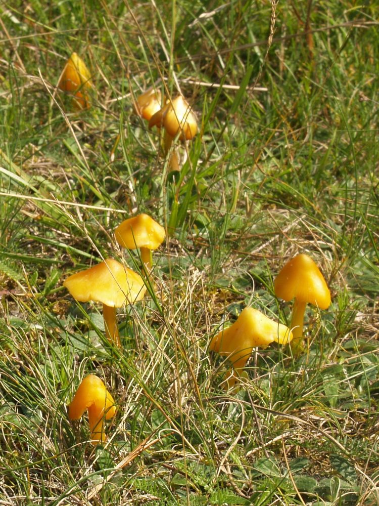 Noch schnell ein Blick auf eine bekannte Wiese. 95% der Fläche waren pilzfrei, aber in einem schattigen, windgeschützten Bereich erschienen die ersten Saftlinge. Obwohl ich die Fläche seit Jahren absuche, überrascht mich immer noch die variable Farbe vom