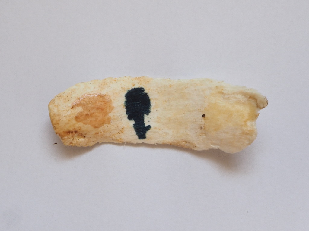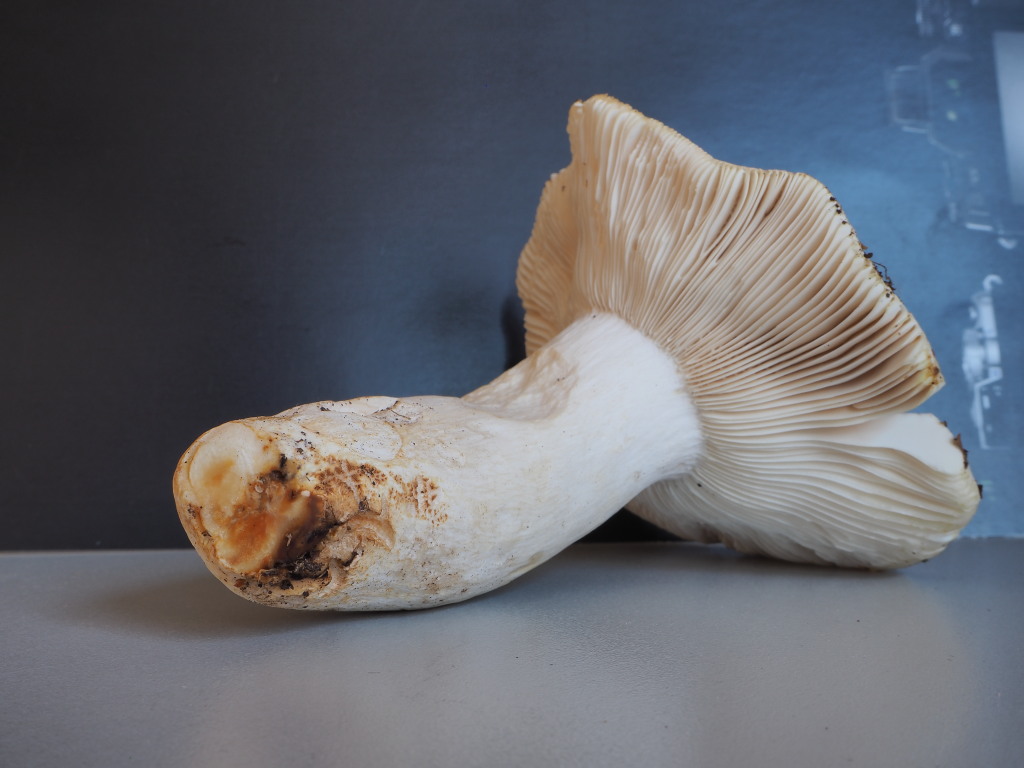 Stiel: H 8cm, Dm 3cm, rel. fest, weiss, berührte Stellen nach Zeit gelb-ocker verfärbend, Basis ocker-braun gefleckt.