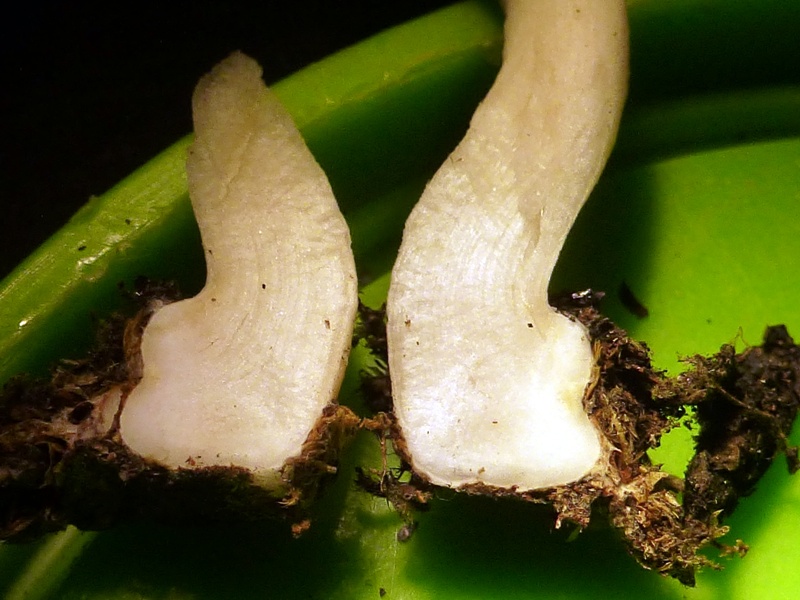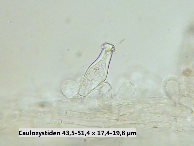 Der Stiel ist innen wie außen ebenfalls weiß, nicht hohl und endet in einer Knolle. Er ist auf ganzer Länge mit Caulozystiden besetzt. Die Basisidien sind 4-sporig.