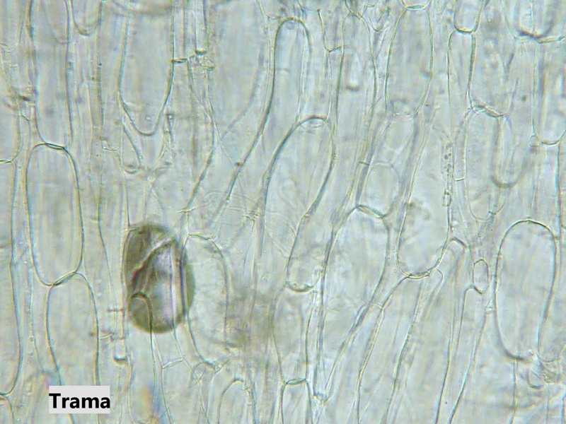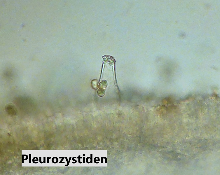 Der Hut ist von Ockerbrauner Farbe, erscheint feucht aber nicht nicht klebrig und ganz leicht bereift. Die Lamellen sind reinweiß, auch die Schneide. Pleurozystiden sind reichlich vorhanden.