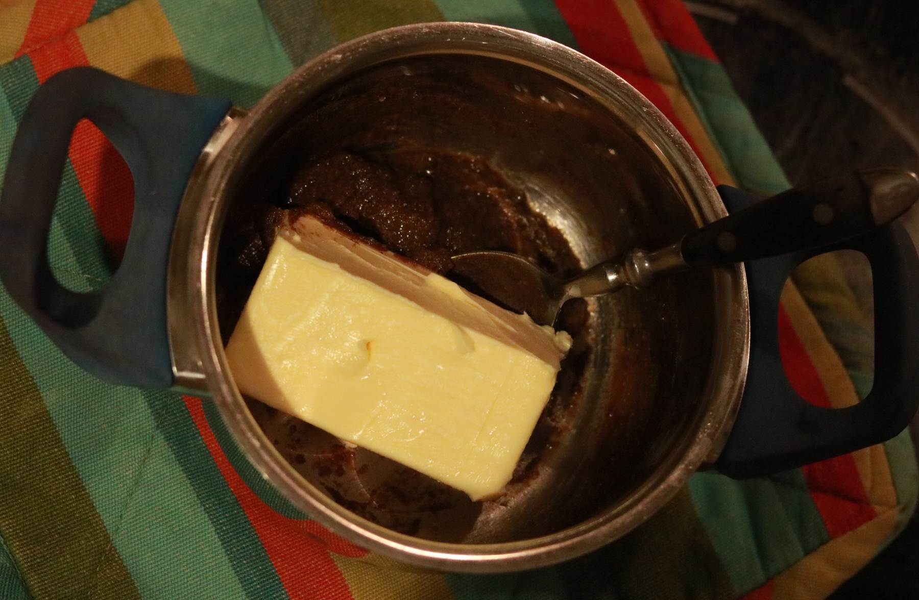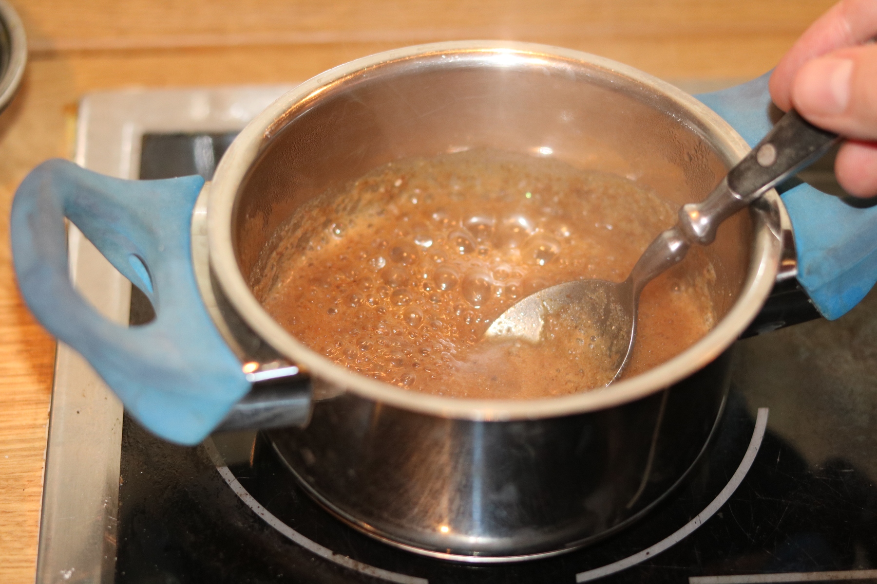 Die Mischung dann abkühlen (z.B. indem man das Pfännchen in kaltes Wasser stellt)- die Mischung muß vor der Weiterverarbeitung nicht VÖLLIG abgekühlt sein- handwarm geht noch.