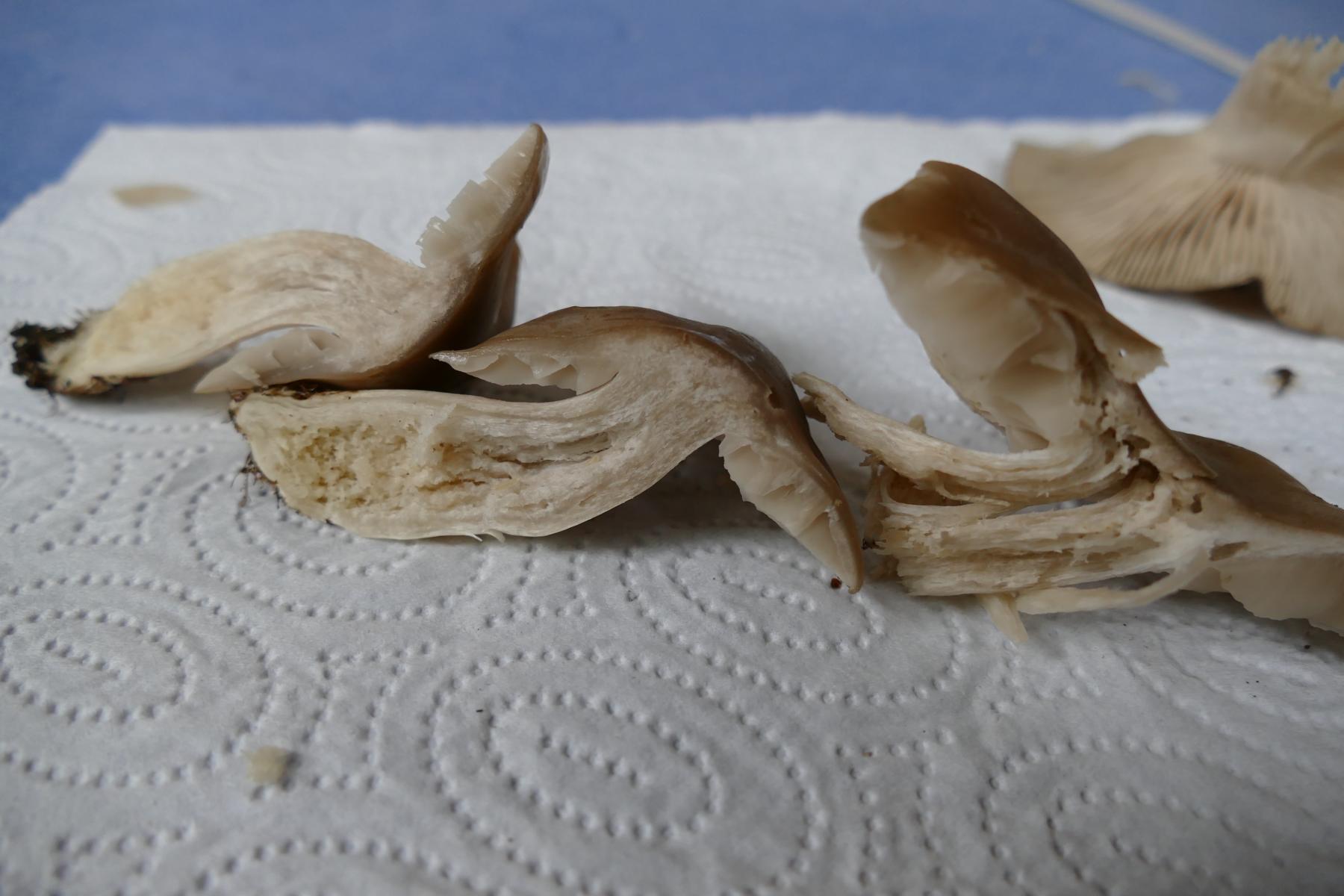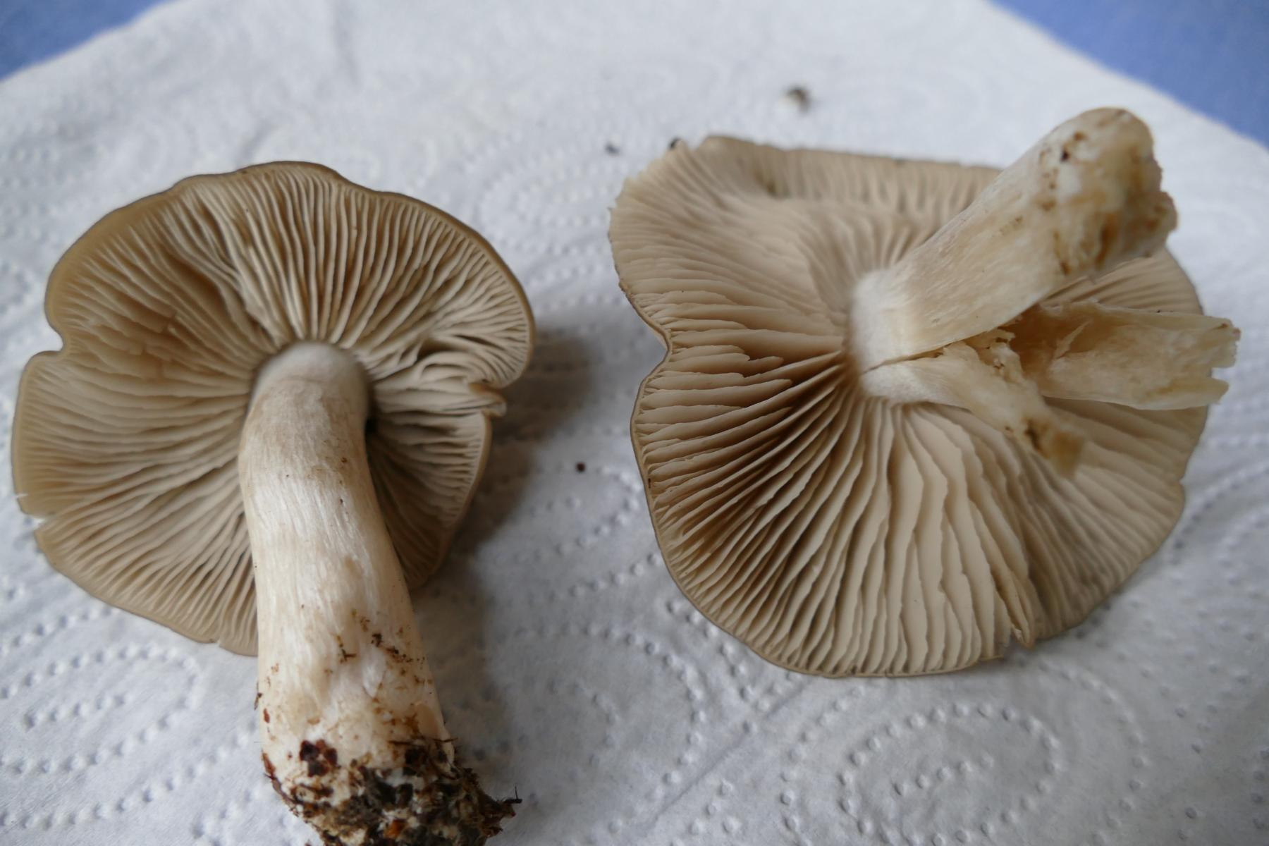 Weiß bis graubraun, beginnen nicht am Stiel (wie heißt denn da das Fachwort?)