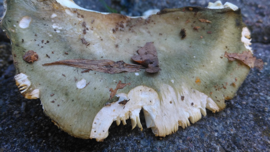 Fundort ist ein Laubmischwald mit vornehmlich Buche und Ahorn, eingestreute Eiche und Birke vorhanden. Boden könnte leicht basisch sein (um Jena gibts das ja häufiger). Ein großer kräftiger Pilz, Hutdurchmesser gute 10cm. Hutfarbe grün (nicht knallig), in der mitte etwas blasser. Huthaut geschätzt 1/4 oder weniger abziehbar. Huthaut NICHT feldrig aufgerissen. Lamellen für Täublinge erstaunlich biegsam, wenn ich nicht sooo sehr wie beim Frauentäubling. Lamellen außerdem oft gegabelt. Stiel nicht gekammert. Sporenpulver weiß.