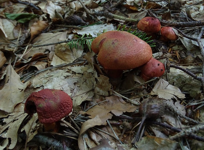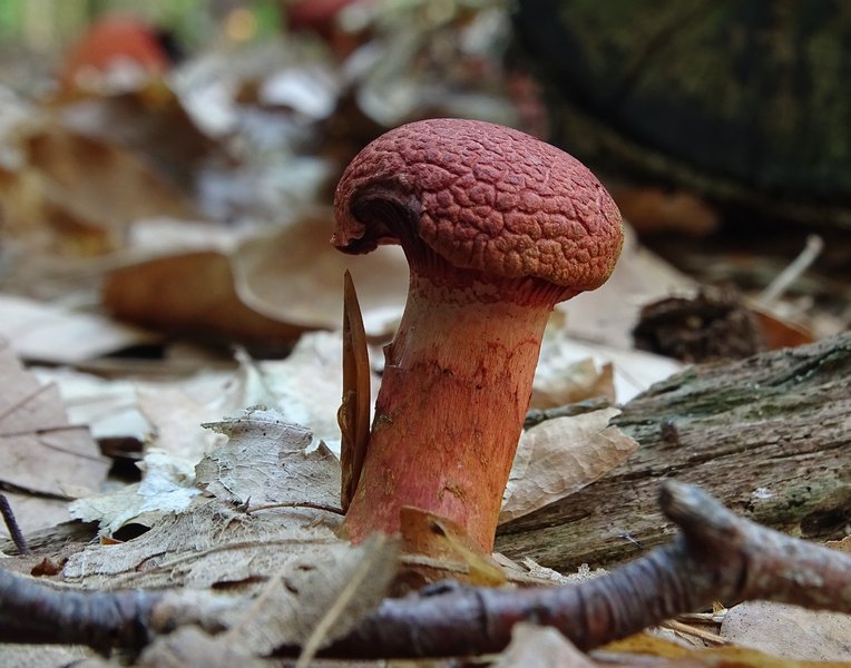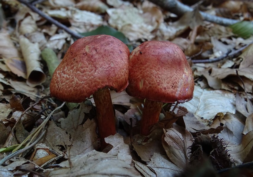 Hut weinrot bis rotbräunlich (wie auf den Bilder zu sehen), ausblassend, 3-5 cm Durchmesser, halbkugelig bis unregelmäßig gewölbt, Huthaut trocken und glatt, manche Expl. auch runzelig.