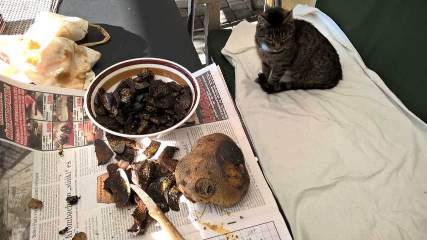 Mein Lieblingspilz hier ist der Erbsenstreuling, der überall dort wächst, wo das Abraummaterial aus dem Bergbau gelagert wurde (Halden, Deponien, Kanalufer). Allein das herzförmige Prachtexemplar wiegt gute 500 Gramm. Von außen kann man die stiellosen "Klumpen" anfangs noch mit Kartoffelbovisten verwechseln, aber beim Anfassen merkst Du schon den Unterschied, die Dinger sind massiv! Beim Aufschneiden erkennst Du die unverwechselbare schwarz-gelbe (passt doch zum Pott, oder? :D ) Kammerung.