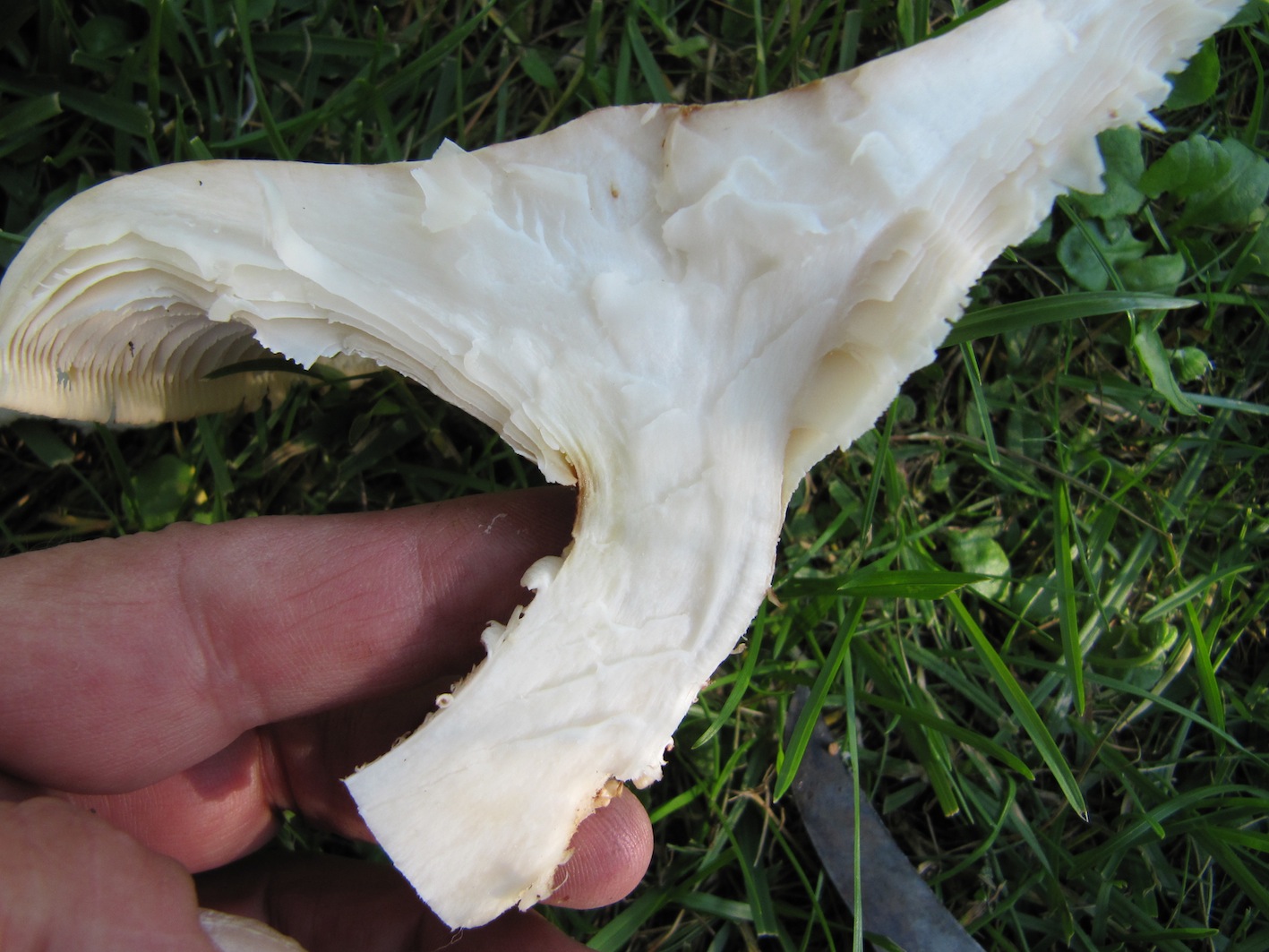 Hut 13 cm, trocken, ganz dezent gebuckelt. Sehr festes, zähes Fleisch mit Anisnote. Lamellen herablaufend, gesägt, am Stielansatz braun, nicht ablösbar.