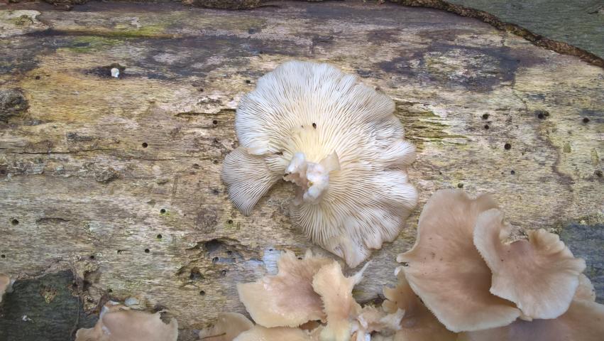 Das sieht mal ganz stark nach >Austernseitlingen< aus, mit kleiner Option auf >Laubholzknäuelinge<, aber da gefallen mir weder die farbverläufe, noch die glänzenden Hutoberflächen, noch die Wuchsweise so richtig.