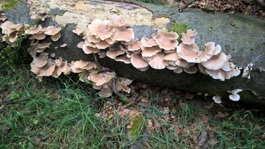 Das sieht mal ganz stark nach >Austernseitlingen< aus, mit kleiner Option auf >Laubholzknäuelinge<, aber da gefallen mir weder die farbverläufe, noch die glänzenden Hutoberflächen, noch die Wuchsweise so richtig.