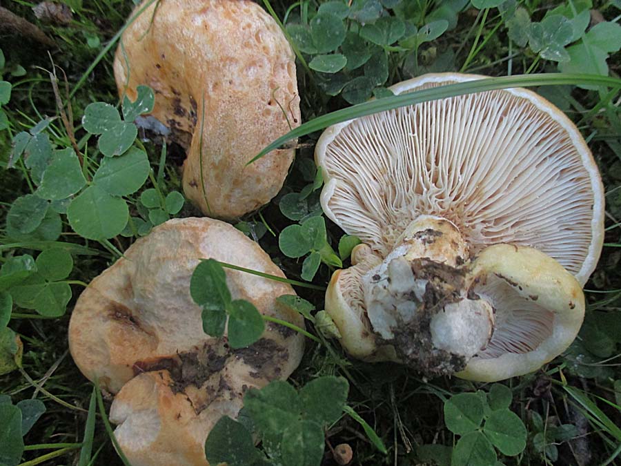 Nach einer pilzarmen Woche wollte ich mal Freitag, den 11.9. mal an einer meiner bekannten Coprinopsis alopecia-Fundorte (Großer Rausportintling) gehen, ob sich da was tut; leider nichts; nur vertrocknete Leichen. Aaaber dafür diese Burschen hier. Die hatten tatsächlich die Frechheit sich auf dem ersten Blick als Saftlinge zu tarnen; bei recht interessanten Lichtverhältnissen (grünliche Hutfärbung). Dass sich Risspilze manchmal vehement der Bestimmung entziehen ist ja bekannt; aaber das sich die Schlingel neuerdings als Saftlinge tarnen, ist dann doch etwas zu frech. Dank meiner neuen saaaataaaanischen Kräfte konnte ich die dann doch als Inocybe maculata (Saftlingsähnlicher Risspilz )