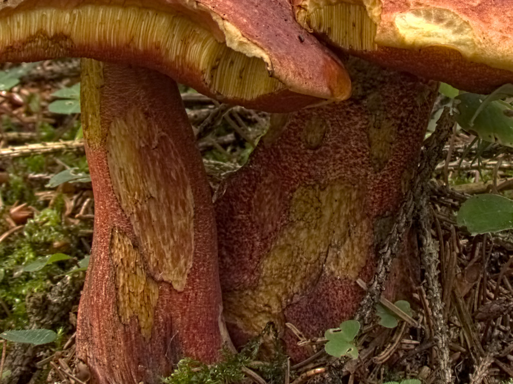 Beim nächsten bin ich mir im Nachhinein nicht ganz schlüssig. Was anderes als Flockenstieliger Hexenröhrling fällt mir, trotz der Rottöne am Hut, aber nicht ein.