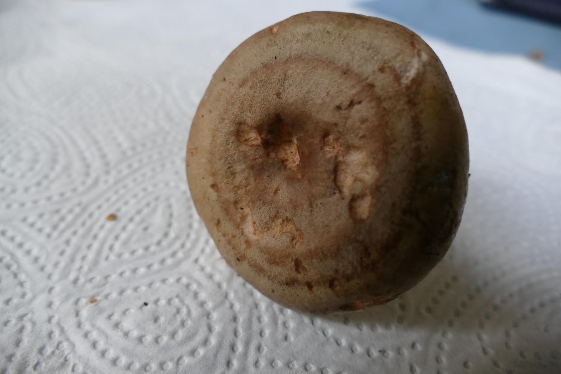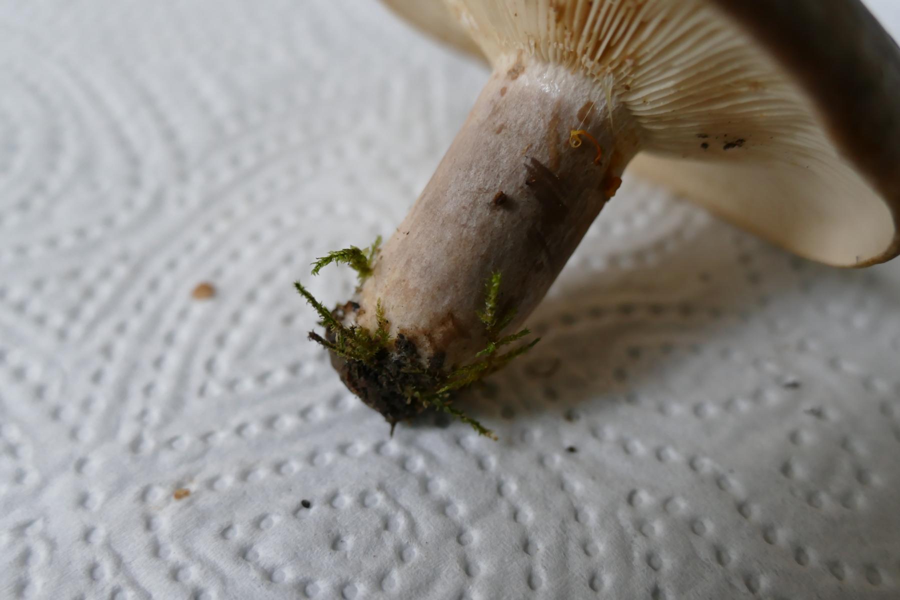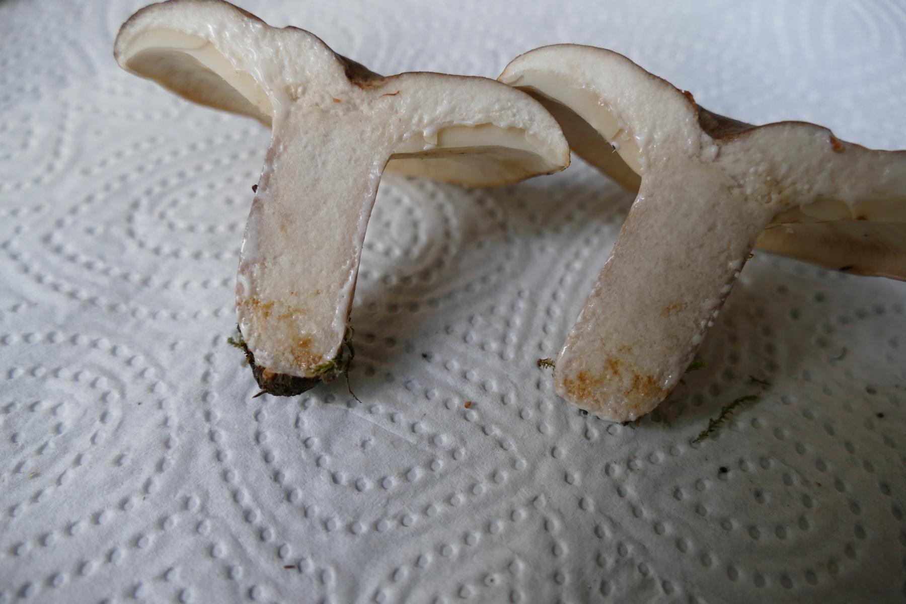 Weiß, färbt nicht nach Anschneiden, an der Stielbasis gelblich (evtl. Maden)