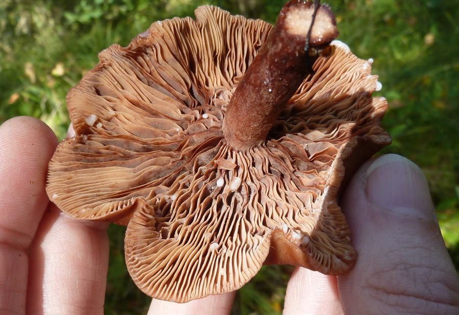 Ein Milchling. Der Kleine milchte ziemlich heftig, ein Tropfen lief mit über die Finger und glitzert auf dem zweiten Foto oben auf dem Hut, aber vorn sieht man ihn noch trocken. Der Pilz roch nach... hm weiß nicht, würzig. So Richtung Maggi, aber nicht wirklich richtig Maggi. Welcher ist das?