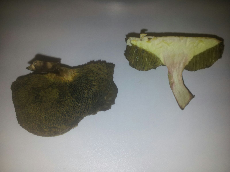 Die Pilze haben eine gewölbte und rissige Kappe, einen Schwamm (grünlich braun, nach dem Schneiden zunehmend braun), der Schnitt ist an Stiel violett gefärbt und die Pilze sind unter dem Hut hell-gelb und am Stil braun und leicht rötlich. Der Fundort ist nahe einem alten Steinbruch und der Boden ist sicher mineralisch, sicher werden die Felder gekalkt und gedüngt.