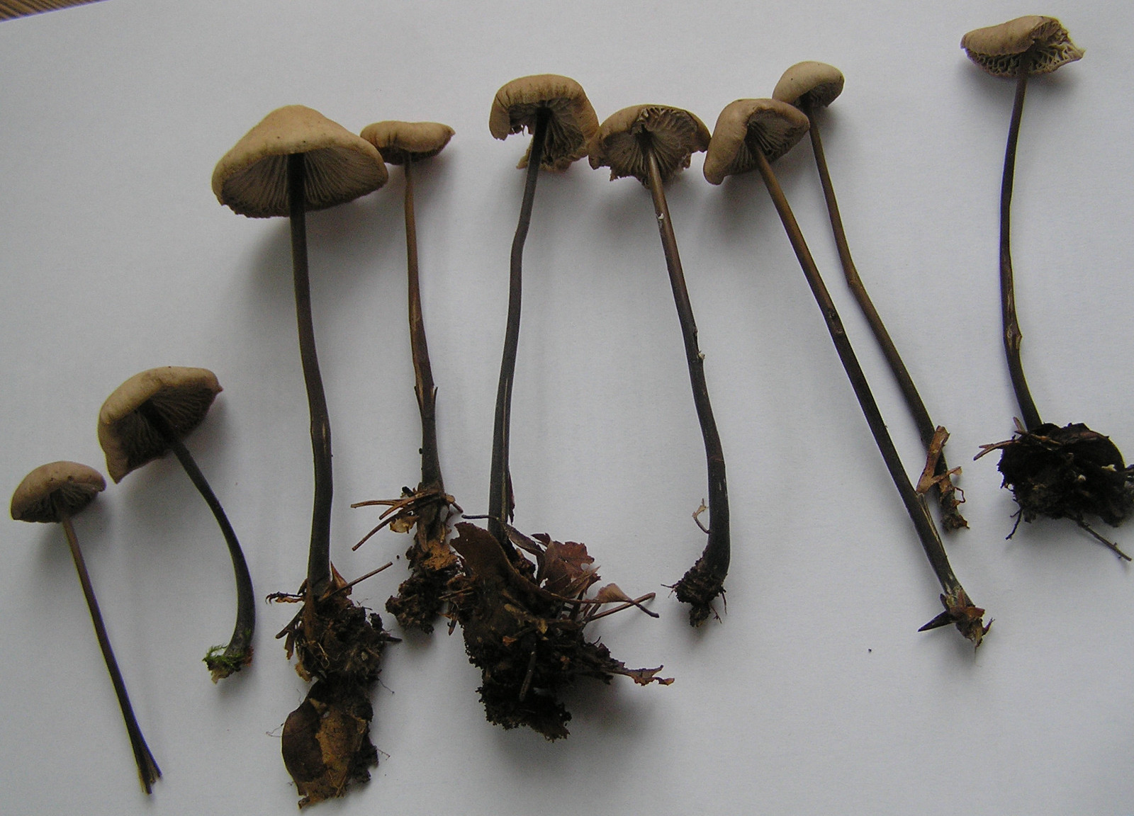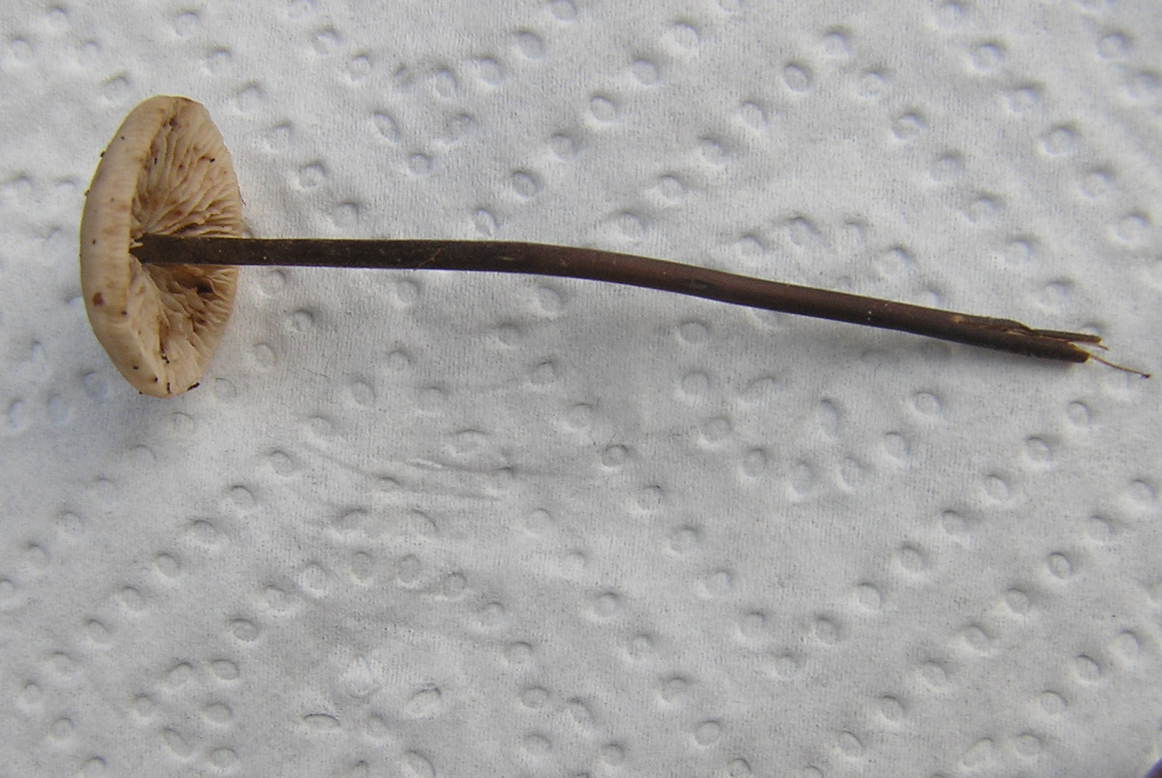 Das hätte ich jetzt rein vom Stiel her vermutet. Wenn die dunkle Farbe von ganz unten bis zum Hut durchgeht, tippe ich schon eher auf den Saitenstieligen Knoblauchschwindling. Im Klassiker "1200 Pilze" sehen sich die Stiele beider Arten auch sehr ähnlich. Da habe ich für den Großen Knoblauchschwindling eher einen Nabel im Hut bzw. einen Kegelhut beim Saitenstieligen in Erinnerung. Mittlerweile denke ich aber, dass die Hutform da nicht allzuviel weiterhilft.