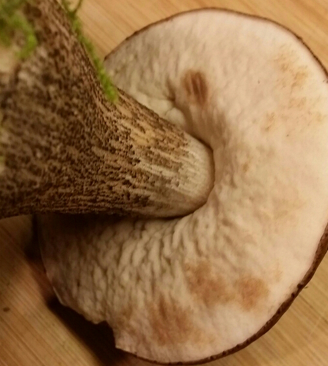 Die Haut vom Hut ist dunkelbraun, das Fleisch weiß. Und der Pilz wiegt ganz gut was. Die Haut vom Hut lässt sich nicht abziehen. Mich verwirrt nur etwas die Farbe vom Stiel wobei der glaub ich einfach vom Dreck so schwarz aussieht.
