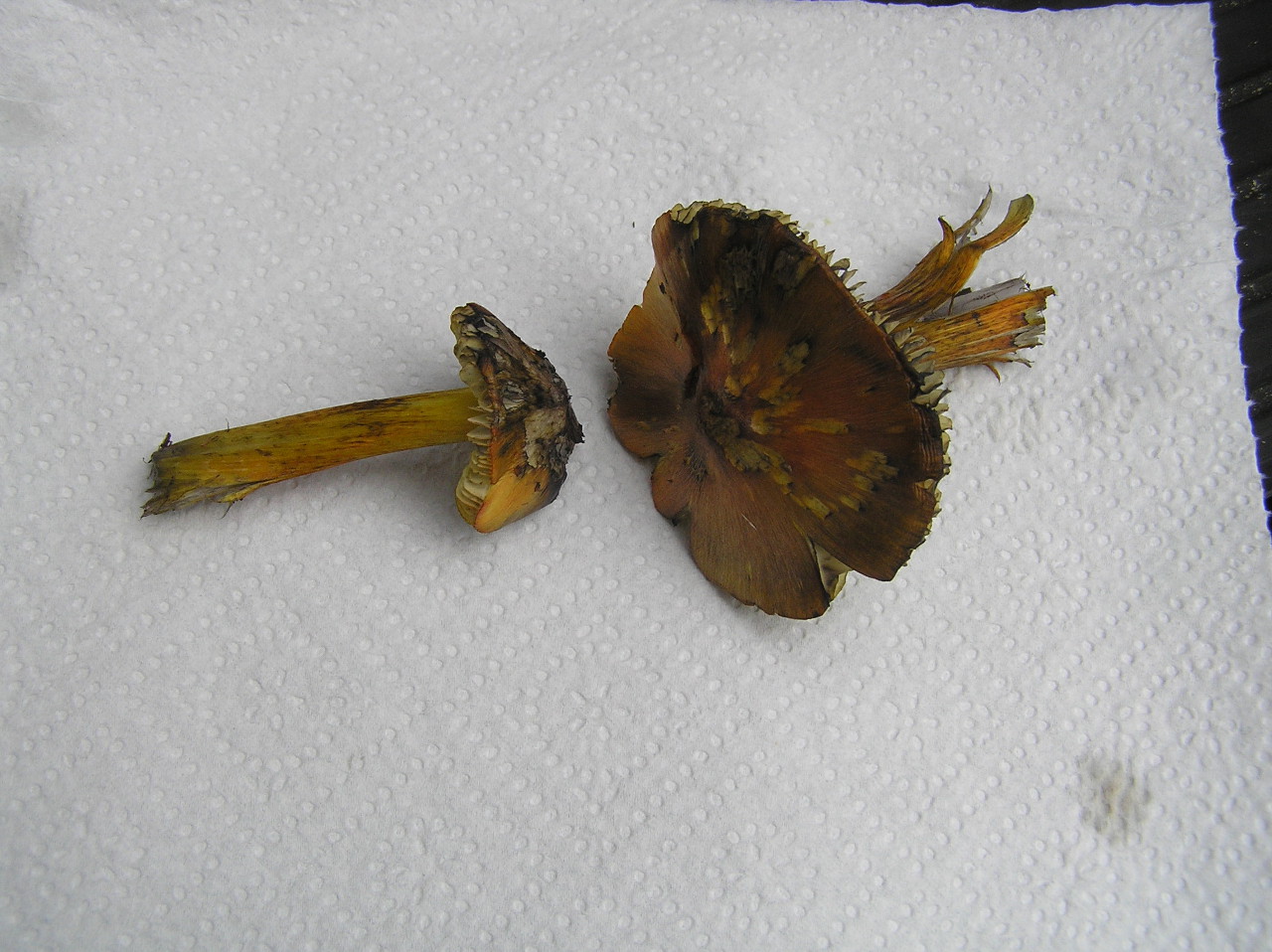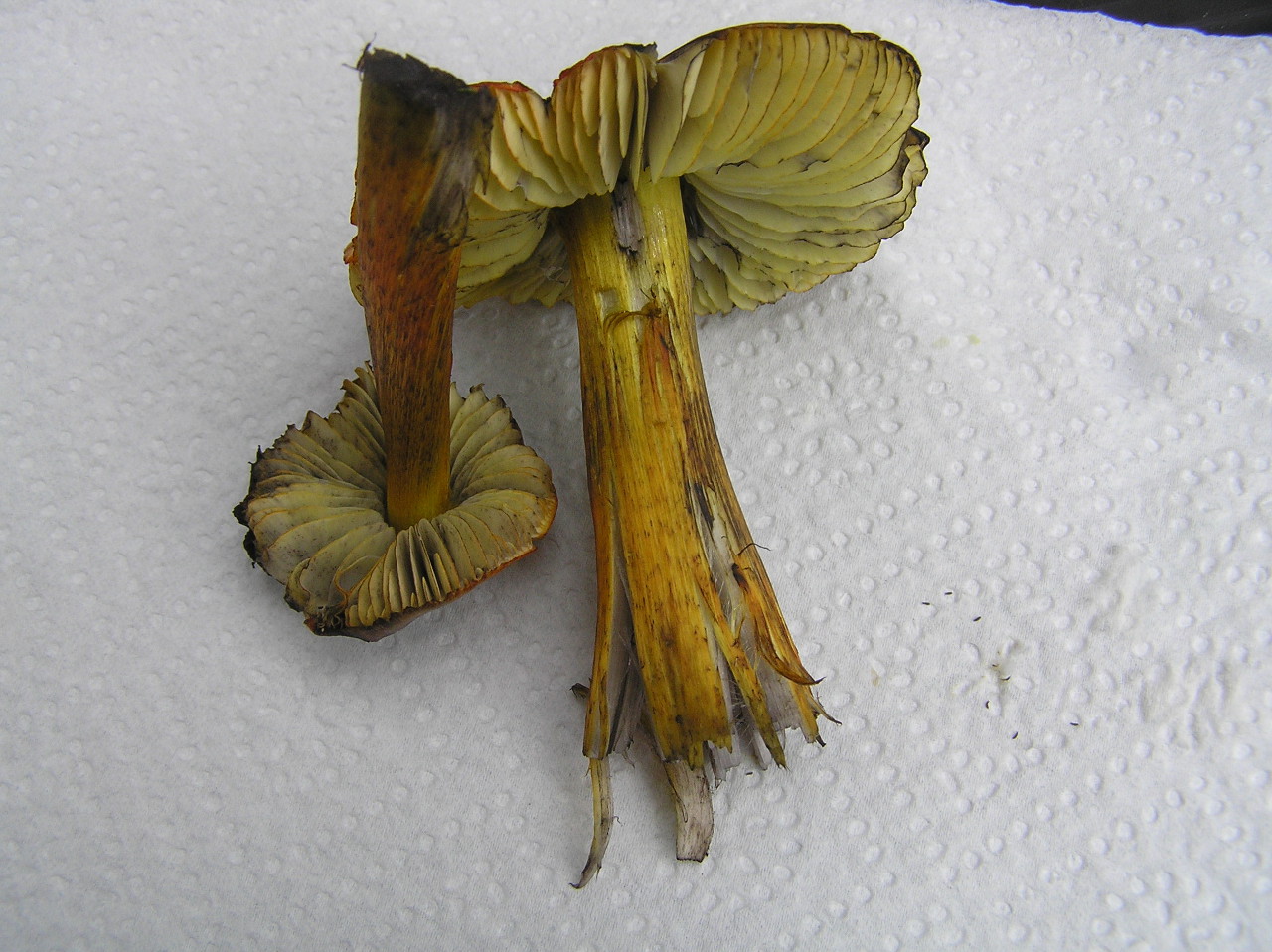 - mittlerweile vermute ich, dass ich Schwärzende Orangesaftlinge (Hygrocybe tristis) oder unter Umständen andere schwärzende Vertreter der Gattung gefunden habe.