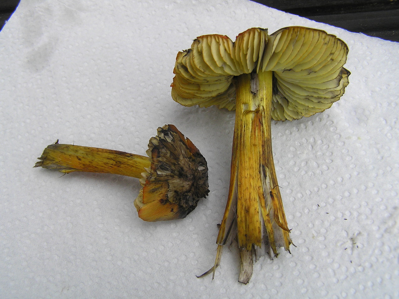 - mittlerweile vermute ich, dass ich Schwärzende Orangesaftlinge (Hygrocybe tristis) oder unter Umständen andere schwärzende Vertreter der Gattung gefunden habe.