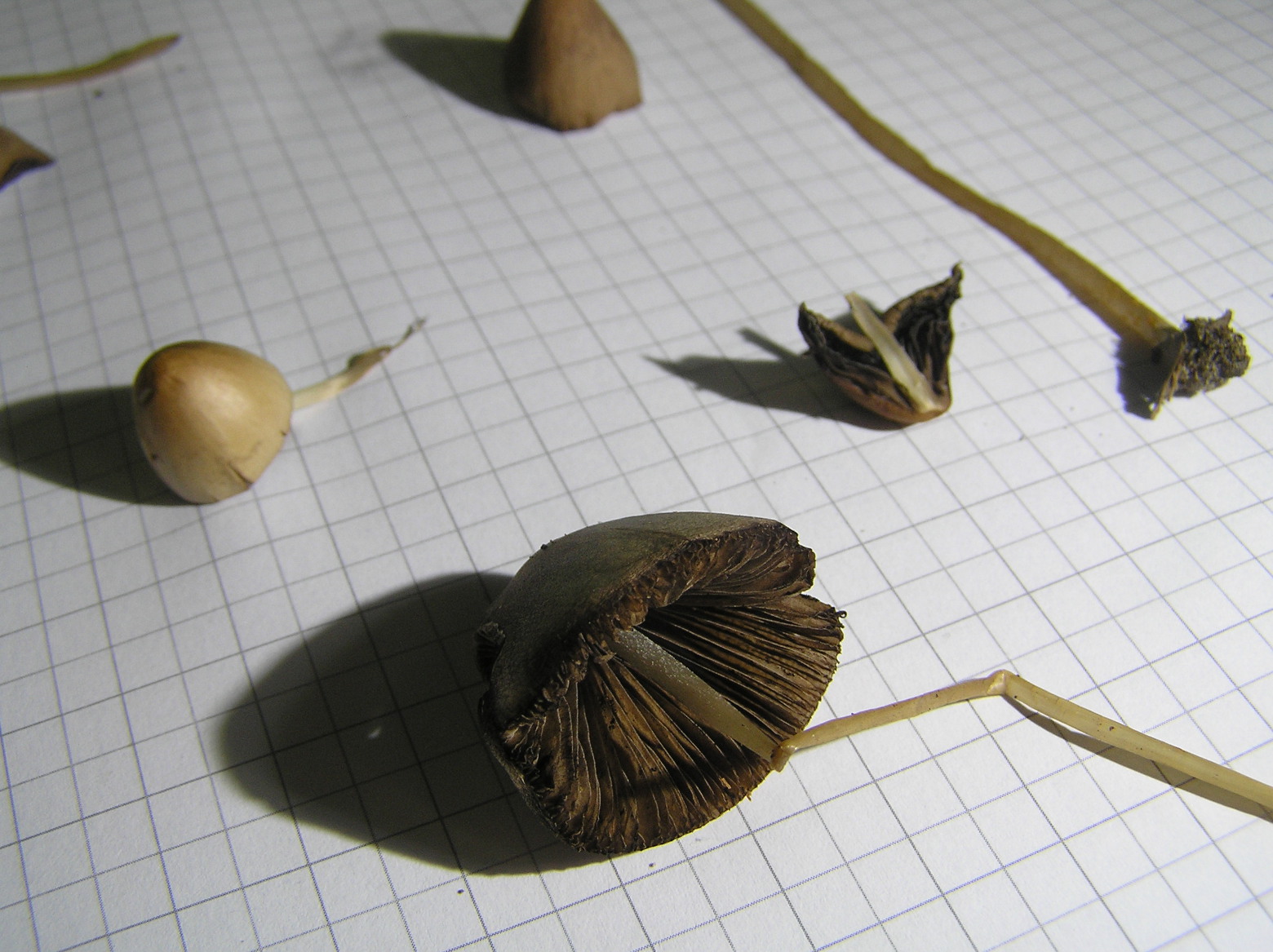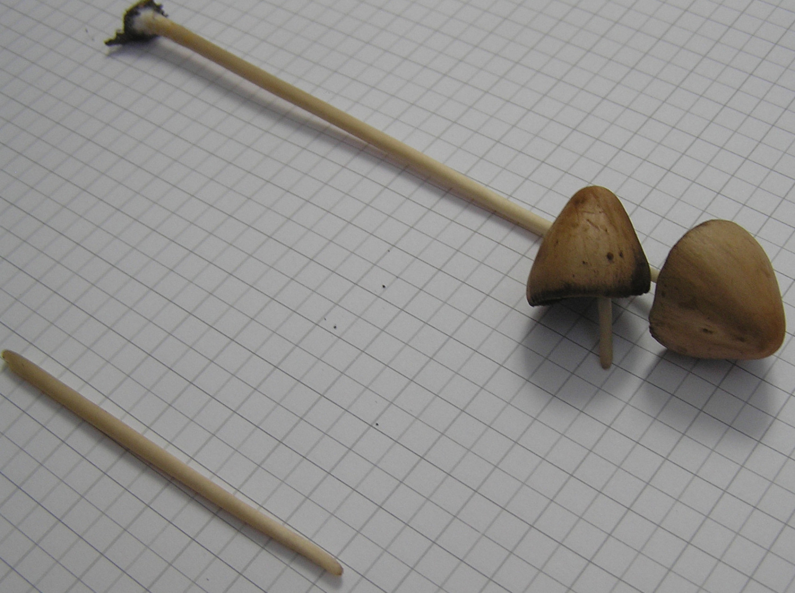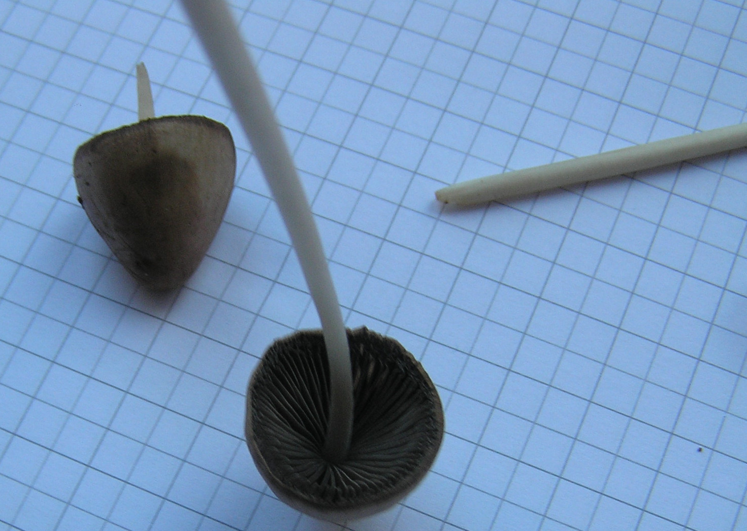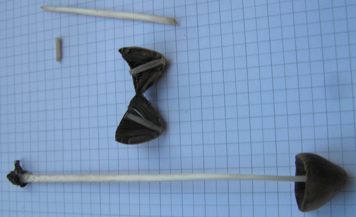 Psathyrellen mit so langem Stiel und so kleinem Hut kenne ich eigentlich nicht, deswegen denke ich nicht, dass es eine Psathyrella ist. Mir sind die Lamellen auch zu dunkel für Psathyrella. Muss nichts heißen; ich bin da kein Experte für die Gattung. Ich würde das eher in Richtung Psilocybe oder so sehen. Panaeolus wäre auch noch möglich; leider sind die Lamellen nicht "gefleckt"; deswegen eher unwahrscheinlich.
