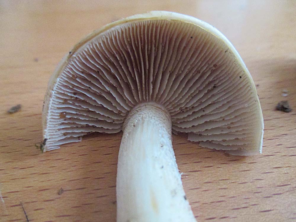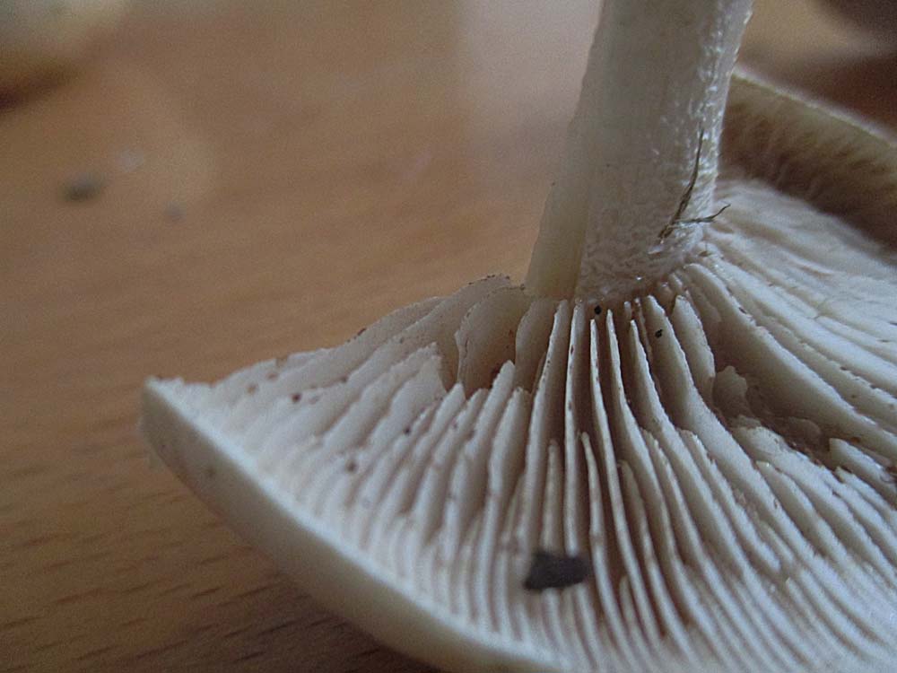 Ist nicht ganz einfach, weil der Stiel eben noch voll und nicht hohl ist, aber er ist da. Sieht wie ein helleres Dreieck vom Hutfleisch aus, das in den Stiel hinunter ragt.