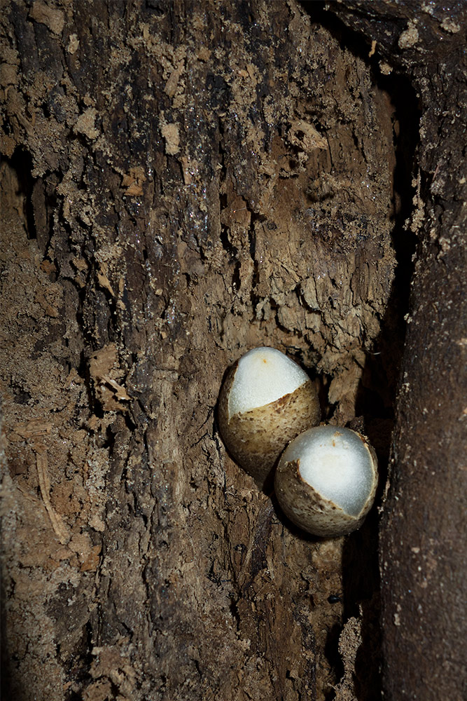 Fundort: in einer Spalte einer großen Buche ca 60cm über dem Boden, gut versteckt. Aber in der aufkommenden Dunkelheit leuchtete mich plötzlich etwas Weißes an. Ich hatte so etwas noch nie gesehen und keine Idee. Größe und Konsistenz (irgendwie weich) erinnerten mich an ein Hexenei - aber an an einem Baum, mit flaumigem Fell, so knallig weiß 8| Da es quasi schon dunkel war habe ich zwei schnelle geblitzte Bilder gemacht (und dazu mit meiner neuen Plizkamera gekämpft - es war der erste Ausflug mit ihr). Ein Exemplar habe ich mitgenommen, es hat beim direkt im Anschluss stattfindenden Treffen der Pilzgruppe Jena helle Begeisterung ausgelöst. Mittlerweile wurde ich aufgeklärt was ich da gefunden habe. Wisst ihr auch? :)