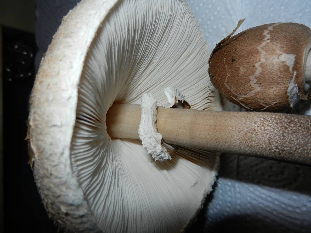 Stiel: Die Stiele haben Durchmesser von 1-1,5 cm, sind bräunlich (zur Stielbasis hin dunkler werdend), ganz innen hohl und haben ein genattertes Muster. Sie fühlen sich allerdings glatt an. Beim Mittleren und Großen Exemplar ist ein freistehender Ring vorhanden. Beim Mittleren erkennt man deutlich dass der Ring zwei aus zwei Teilen aufgebaut ist. Beim größeren Exemplar ist der Ring stark verkümmert. Mit etwas Hin-und Hergeschiebe lassen sich die Ringe lösen und dann frei bewegen. Die Stielbasis würde ich am ehesten als rübenknollig bezeichnen.