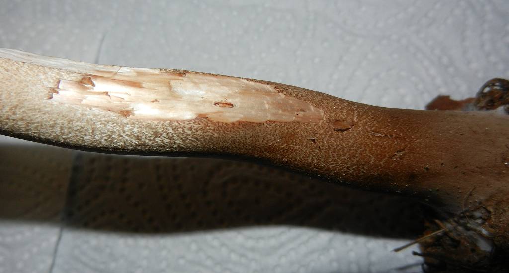 Stiel: Die Stiele haben Durchmesser von 1-1,5 cm, sind bräunlich (zur Stielbasis hin dunkler werdend), ganz innen hohl und haben ein genattertes Muster. Sie fühlen sich allerdings glatt an. Beim Mittleren und Großen Exemplar ist ein freistehender Ring vorhanden. Beim Mittleren erkennt man deutlich dass der Ring zwei aus zwei Teilen aufgebaut ist. Beim größeren Exemplar ist der Ring stark verkümmert. Mit etwas Hin-und Hergeschiebe lassen sich die Ringe lösen und dann frei bewegen. Die Stielbasis würde ich am ehesten als rübenknollig bezeichnen.