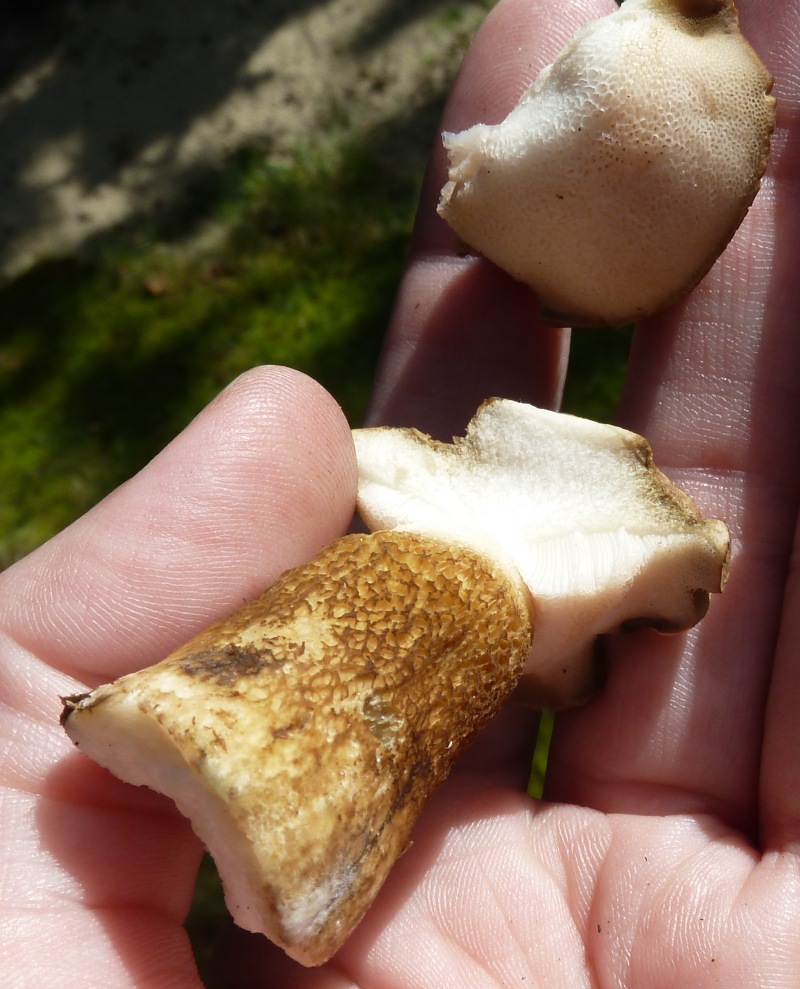 Einspruch, Euer Ehren. Ich will beim Gallenröhrling bleiben. Der Hasenröhrling hat einen glatten, auf jeden Fall nie einen schuppig genetzten Stiel. Klar ist das Foto suboptimal, aber von oben würde man sicher auch eine graufilzige Hutoberfläche sehen. Und was genau sollte an den Röhrenmündungen nicht passen?