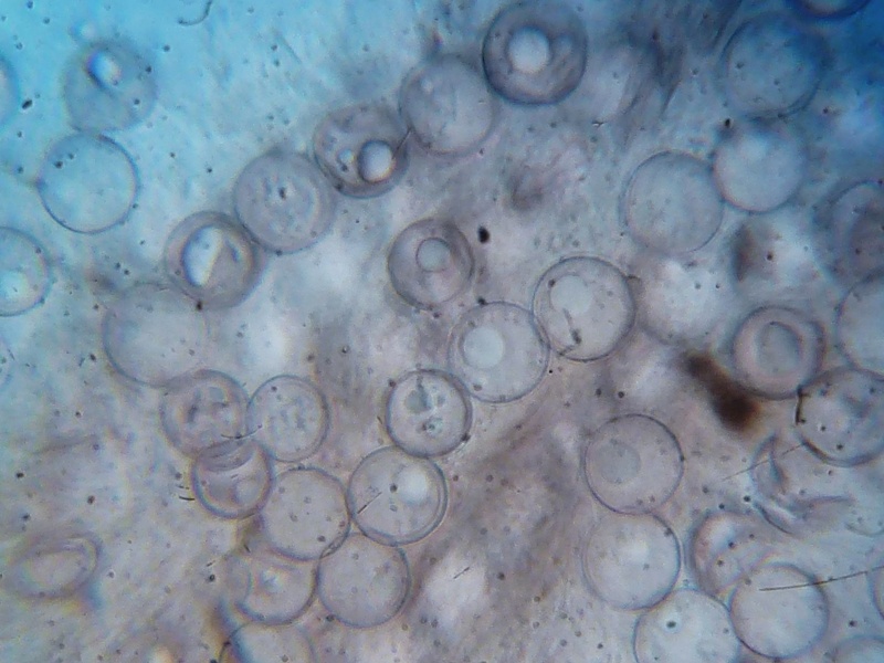 Peter hatte mir eine Probe mitgebracht. Nicht mehr frisch, aber wenigstens Sporen hab ich noch gefunden. Ich bin sehr sicher, das hübsche Teil gehört in die Gattung Smardaea. Kugelrunde Sporen mit einem Durchmesser von 10,2 - 11,1 µm lassen darauf schließen. Wenn ich recht habe, kommt Smardaea planchonis in Frage.
