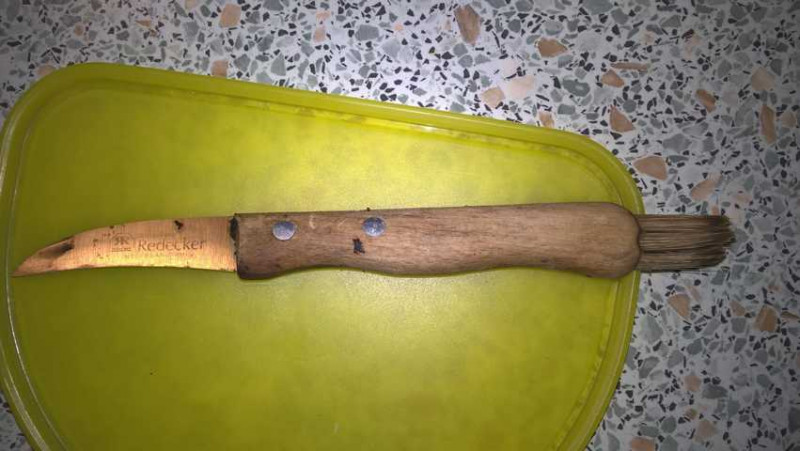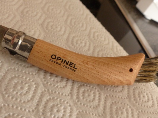 Der Pinsel ist praktisch, die Klinge jedoch für diesen Zweck absolut untauglich. Speziell wenn es darum geht Fraslöcher aus den großen Kappen oder Stielen auszuschneiden. Glatt durchgefallen. Jetzt weiß ich auch warum der alte Herr dieses Messer nur ein einziges Mal benutzt hat nachdem er es von uns geschenkt bekommen hatte. Ich bleib bei meinem gewohnten Messer, mit diesem Opinel schlafen einem beim Putzen die Füsse ein.