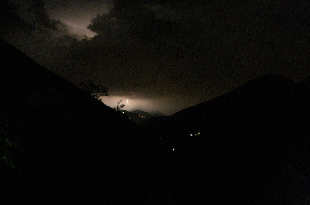 Ich habe versucht, einen richtig schönen Blitz abzubilden. Man sollte meinen, bei dem Stakkato an durch die Wolken und auf die Berge fahrenden Blitzen kein Problem, aber leider doch nicht so einfach. Dieses Fitzelchen war noch das Beste.