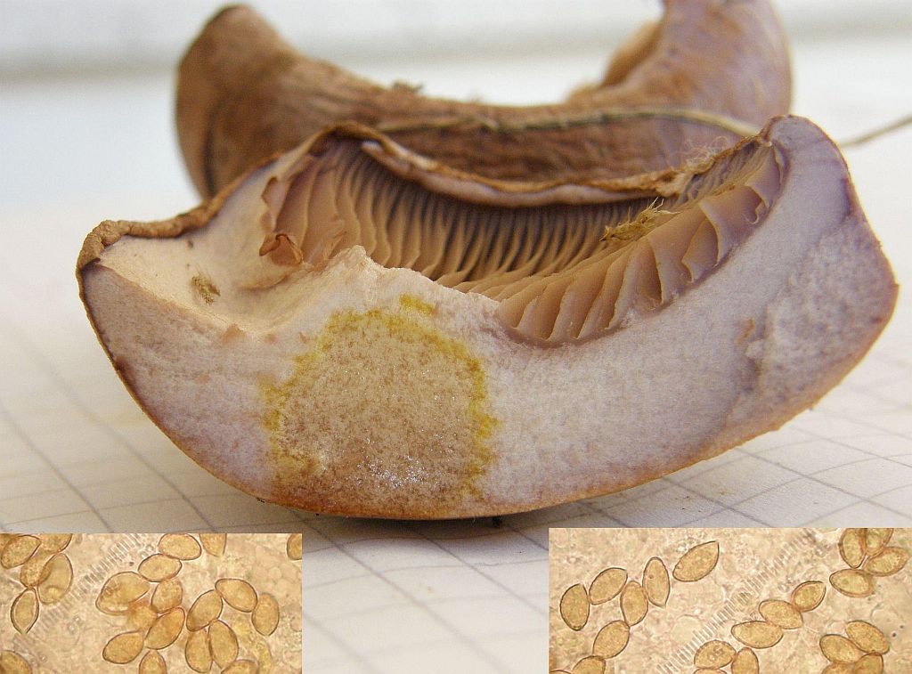 Mikros : Sporen etwas langgezogen mandelförmig , 8,8-11,6 X 4,5-6,1 µm. Basidien 4-sporig , Schnallen vorhanden.