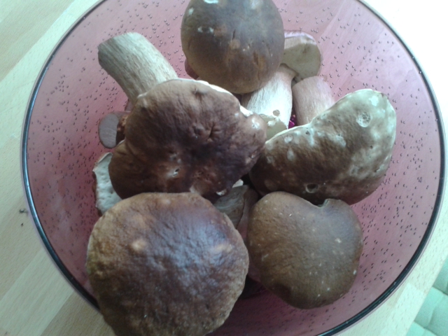 ich sehe in deiner Schüssel Steinpilze, so weit das zu erkennen ist. Du solltest mal ein bisschen an den Einstellungen deiner Kamera drehen, für mich haben die Bilder einen starken Blau-Stich, das macht es nicht einfacher, etwas zu erkennen