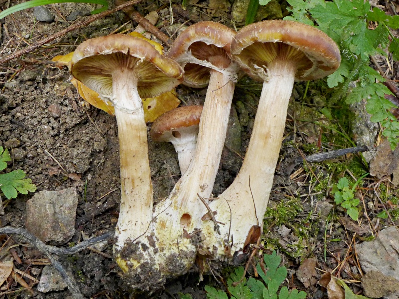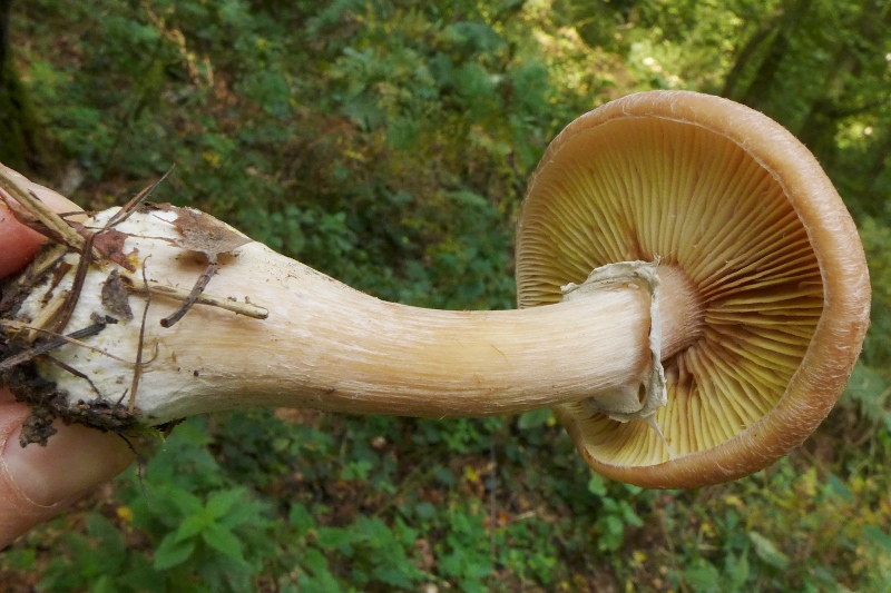 A. solidipes zum Vergleich sollte zwar manchmal eine leichte Stielverdickung haben, aber überwiegend dunklere Farben (bleibende grobe Schuppen) ohne Gelbanteile (außer Basismyzel), vor allem nichts Gelbes an Hut, Stiel und Lamellen (oder bei der "Laubholz-Form" doch etwas gelblich....). Ringunterseits immer deutliche dunkle Pünktchen.