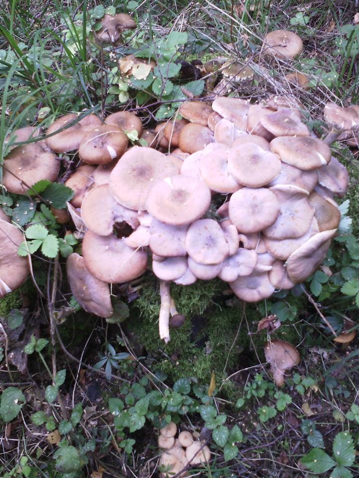 alles Hallimasch, und alles zu alt zum Essen. Hallimasch bitte nur sammeln, wenn die Hüte noch geschlossen sind (d. h. man die Lamellen noch nicht offen sieht). Angeblich haben einige Leute Magen-Darm-Probleme auf Hallimasch, das könnte auch daran liegen, dass so was gern mal gegessen wird.