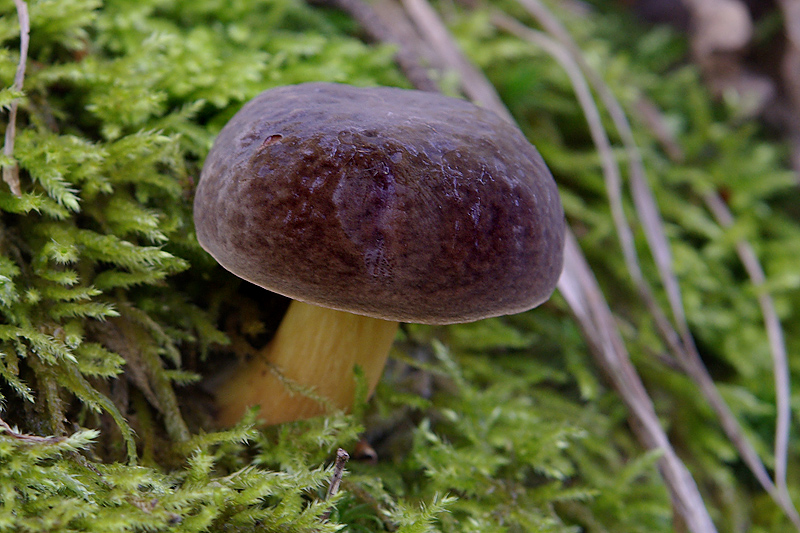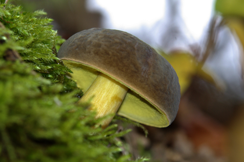 Es soll sich um einen Röhrling mit dunkelgrau/bläulichem Hut und leuchtend gelbem Stiel und Röhren handeln, der auf einem Moospolster im Mischwald gewachsen sei. Hutdurchmesser ca. 4 cm.