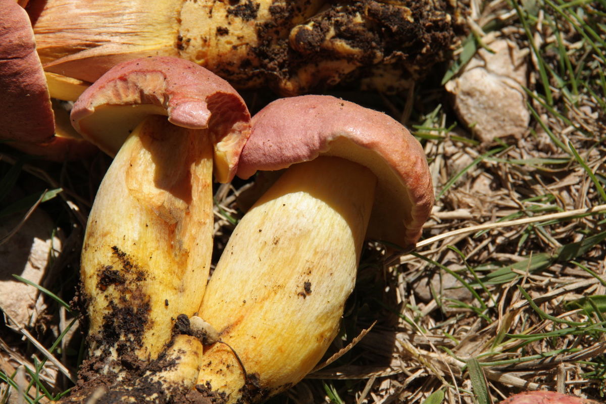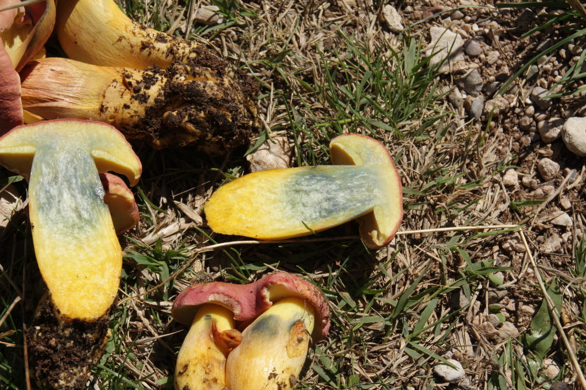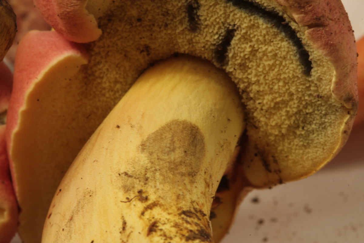 Ich bin ja hier relativ schnell vom Blauenden Königsröhrling Butyriboletus fuscoroseus (früher: pseudoregius) ausgegangen. Farben stimmen, und er blaut. Allerdings gibt's da ein paar Dinge, die meine Exemplare -laut Literatur - von B. fuscoroseus unterscheiden: