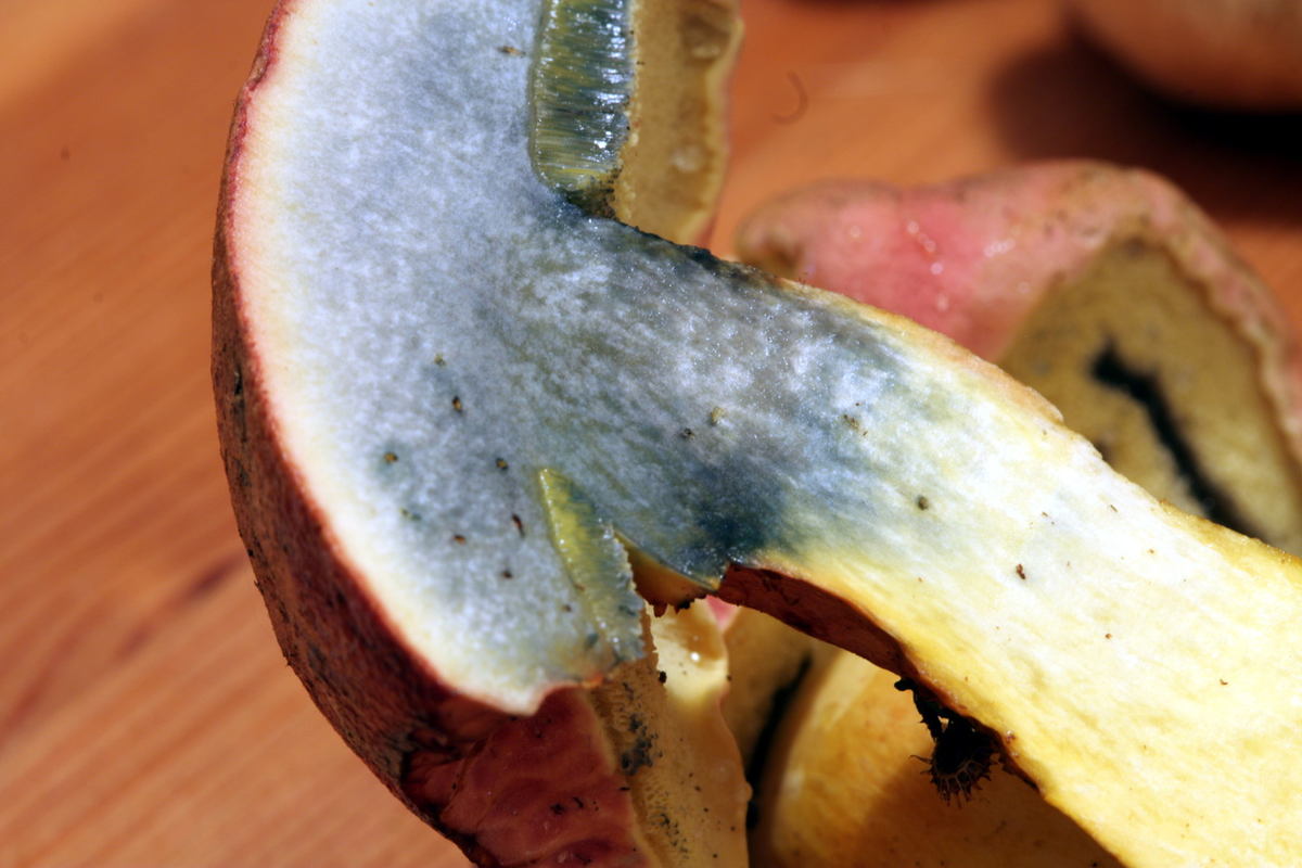 Röhren: Röhren und Poren gelb, Poren auf Druck stark blauend, fast schwarz, Röhren im Anschnitt blauend. Röhrenboden gelb, bei Luftkontakt blauend.