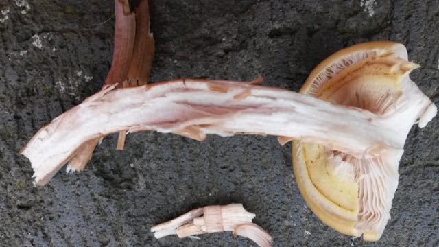 Der Pilz parasitiert offenbar das Kambium denn die Rinde löst sich in langen Segmenten ab.