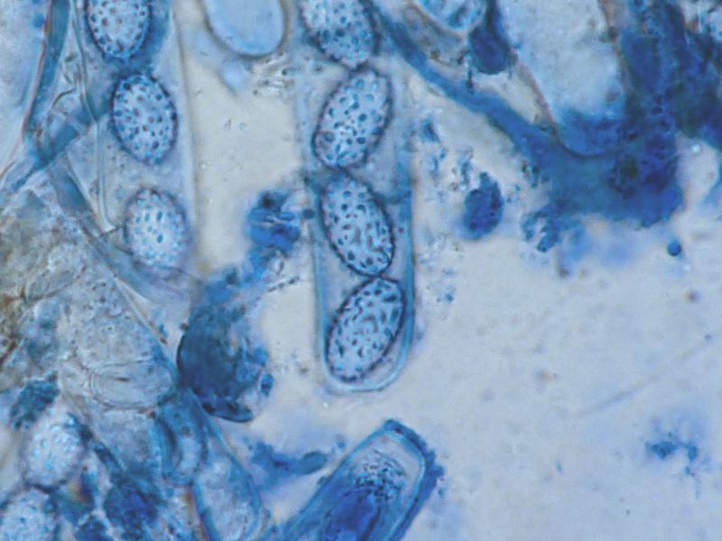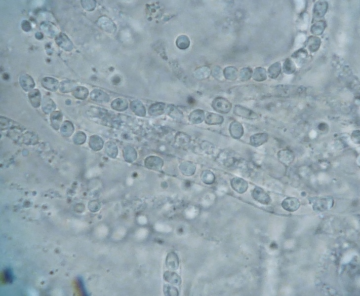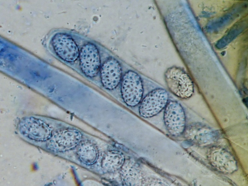 Und noch unbekannt. Ein 16-sporiger Ascomycet, der auf einem Saftporling gewachsen ist. Den Saftporling hat Jan-Arne angeschleppt. Saftporling ? Kuck mal was da drauf wächst. 8|