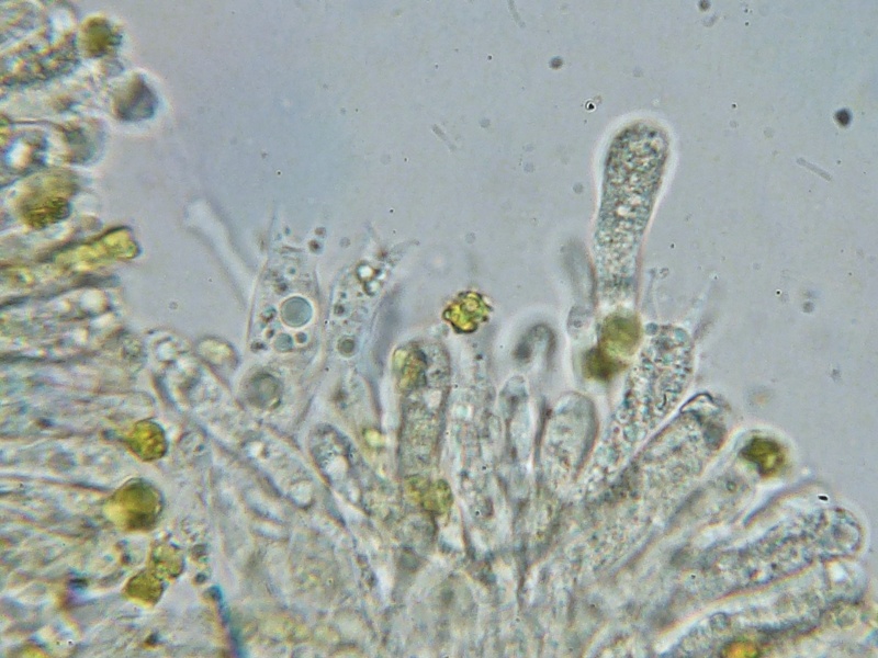Bei dem gelben Exemplar handelt es sich m.M. nach um Clavulinopsis helvola, die Goldgelbe Wiesenkoralle. Möglicherweise nicht ganz reif, denn freie Sporen konnte ich kaum finden. Die Sporen sind grobstachelig, goldgelb gefärbt und messen um 5 x 4 µm. Das ist aber mit Vorbehalt, da ich mich in der Gattung kaum auskenne. Meinungen sind willkommen.