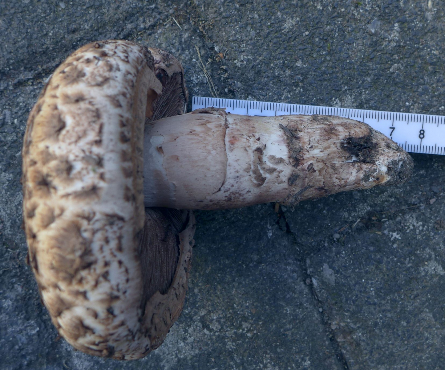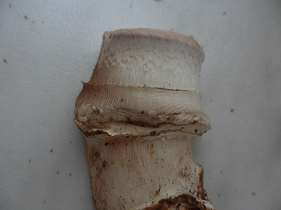 Inzwischen habe ich starke Zweifel, ob es sich um dieselbe Art handelt, da z.B. unterhalb vom Ring die faserige Struktur fehlt. Auch die Proportion zwischen Hut und Stiel ist ganz unterschiedlich.